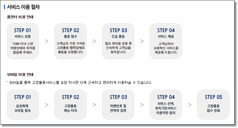 서비스 이용방법은 간단합니다. 콜센터를 이용할 경우 1588-5114으로 전화를 걸어 2번을 누르고 차량 상태와 위치를 말하면 가까운 서비스 기사 분이 장비를 갖추고 방문해 문제를 해결해주십니다. 모바일 어플로도 가능합니다. 삼성화재 모바일을 다운 받고 접속 해 고장출동 메뉴를 터치하고 차량번호와 연락처를 입력하면 담당 기사 분이 신속하게 문제를 해결해줍니다.