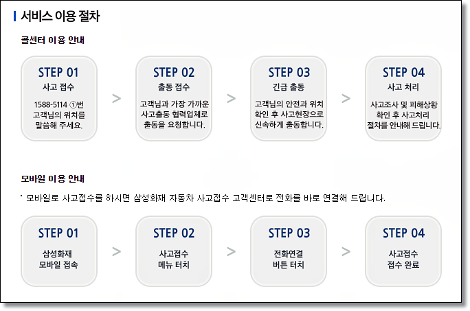 서비스 이용방법은 간단합니다. 콜센터를 이용할 경우 1588-5114으로 전화를 걸어 2번을 누르고 차량 상태와 위치를 말하면 가까운 서비스 기사 분이 장비를 갖추고 방문해 문제를 해결해주십니다. 모바일 어플로도 가능합니다. 삼성화재 모바일을 다운 받고 접속 해 고장출동 메뉴를 터치하고 차량번호와 연락처를 입력하면 담당 기사 분이 신속하게 문제를 해결해줍니다.