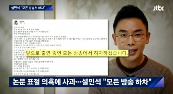 설민석은 석사 학위 논문 표절과 관련해 “다른 논문들을 참고하는 과정에서 인용과 각주 표기를 소홀히 했음을 인정한다”며 “변명의 여지가 없는 자신의 과오”라고 말했습니다.