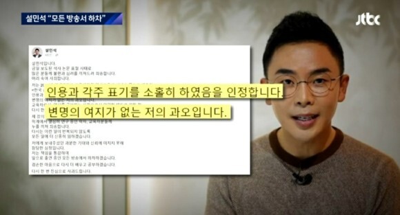설민석은 석사 학위 논문 표절과 관련해 “다른 논문들을 참고하는 과정에서 인용과 각주 표기를 소홀히 했음을 인정한다”며 “변명의 여지가 없는 자신의 과오”라고 말했습니다.