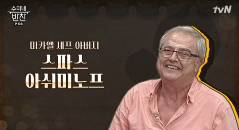 미카엘 셰프는 아버지에 대해 "아버지는 5년 전 은퇴 후 체중이 늘어 130kg이 됐고 얼굴도 많이 늙었다. 나는 그 모습을 보고 한국으로 들어오시게 했다"고 밝히며 "처음엔 낯선 나라에 대한 두려움 때문에 쉽게 선택하지 못했지만, 우리만 믿고 오시게 했다. 다행히 한국 생활에 완벽히 적응했다.“라고 설명했습니다.