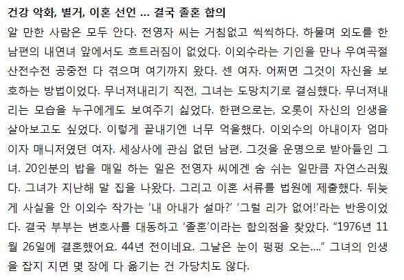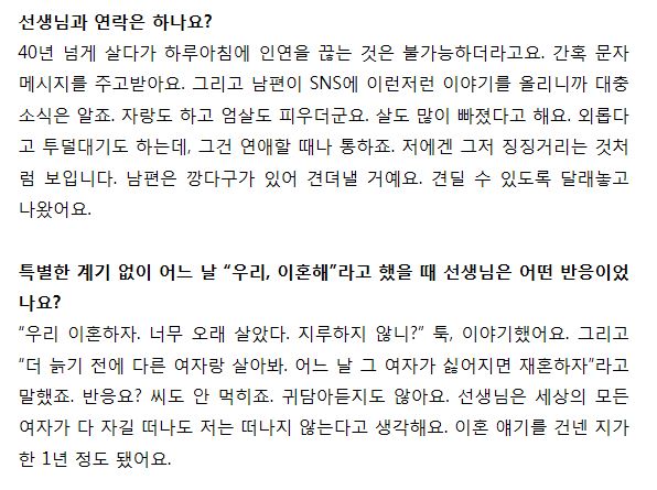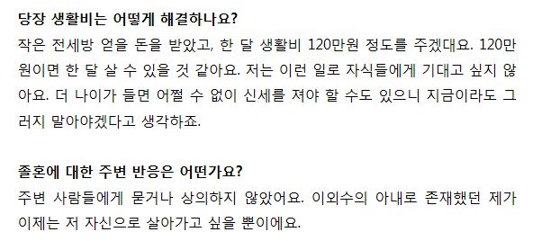 이외수 부인인 전영자씨는 한 매체와의 인터뷰에서 건강이 나빠지면서 여러가지 생각이 들었대요. 남편 이외수가 이혼을 원치 않아서 결혼 44년만에 지난해 말에 졸혼으로 합의하고 별겨를 시작했다고 했다고 말하며 지금이라도 내 인생을 찾고 싶다고 잘 해낼 수 있을지 걱정 되지만 마음만은 편안하다고 담담하게 말을 했어요.
