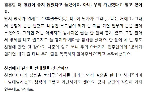 그런데 이렇게 힘든 결혼 생활이었으면 포기할 만도 했을텐데 전영자씨는 이것을 그저 참고 견디며 살아 오다가 이번에는 자신도 몸이 좋지 않아지자 졸혼을 결심했다고 하네요.