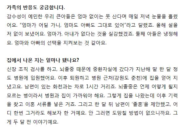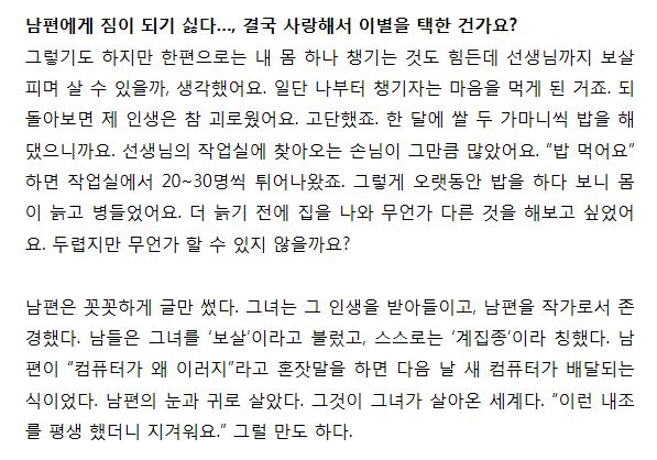 이외수 부인인 전영자씨는 한 매체와의 인터뷰에서 건강이 나빠지면서 여러가지 생각이 들었대요. 남편 이외수가 이혼을 원치 않아서 결혼 44년만에 지난해 말에 졸혼으로 합의하고 별겨를 시작했다고 했다고 말하며 지금이라도 내 인생을 찾고 싶다고 잘 해낼 수 있을지 걱정 되지만 마음만은 편안하다고 담담하게 말을 했어요.