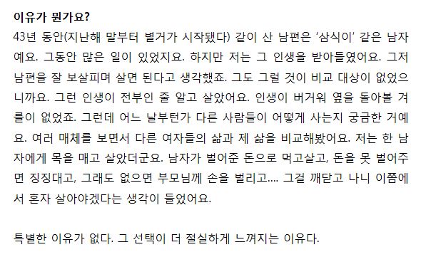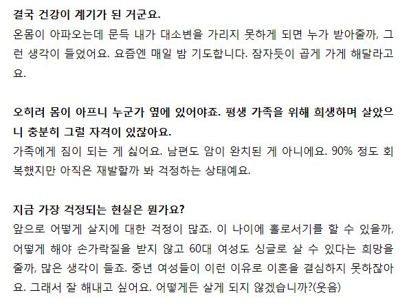 그런데 이렇게 힘든 결혼 생활이었으면 포기할 만도 했을텐데 전영자씨는 이것을 그저 참고 견디며 살아 오다가 이번에는 자신도 몸이 좋지 않아지자 졸혼을 결심했다고 하네요.