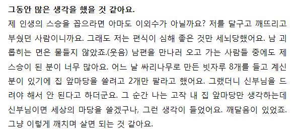 나라면 이렇게 살수 있었을까...하는 존경심이 드네요.