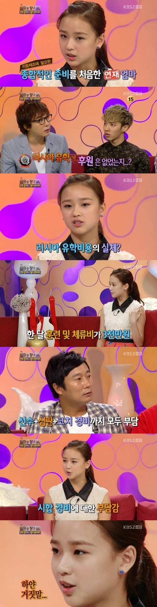 손연재: "러시아에서 훈련하기 위해서는 1달에 3천만원 정도의 비용이 들어요. 제가 외국인이라 비용이 더 들었죠. 제가 러시아 현지 선수들을 운동시켜주는 느낌이었어요."