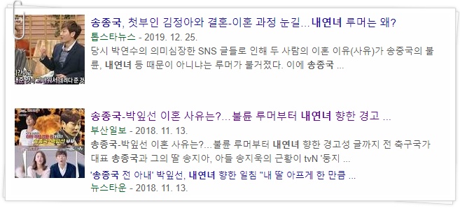 송종국 박잎선 이혼 이유가 송종국의 분륜설로 불거지기도 했었다. 송종국 불륜의 핵심은 송종국 내연녀로 연관검색어로 나오고 있는 김다예린양이라고 한다. 그런데, 사실 박다예린양은 송종국의 의조카라고 하니, 내연녀, 불륜은 거짓 정보인 것으로 보인다.