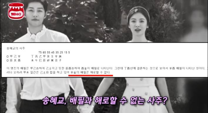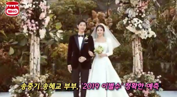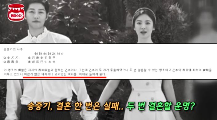 이석호씨는 이 둘의 궁합을 풀이하며 "송혜교의 사주는 배필이 해로할 수 없고 송중기의 사주에는 바람이 많은 여자거나 과거있는 여자를 아내로 들이게 된다”고 하면서 2019년에는 이별수가 있다는 글을 남겼었어요.
