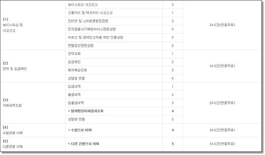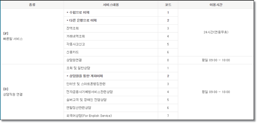 다음은 ARS 단축코드 안내입니다. #버튼은 빠른말 서비스로 계좌이체 및 잔액조회, 거래내역 조회, 각종사고신고, 신용카드, 상담원 연결이 가능합니다. 0번은 상담직원 연결로 조회 및 일반상담을 통한 각종 상담을 받으실 수 있습니다.