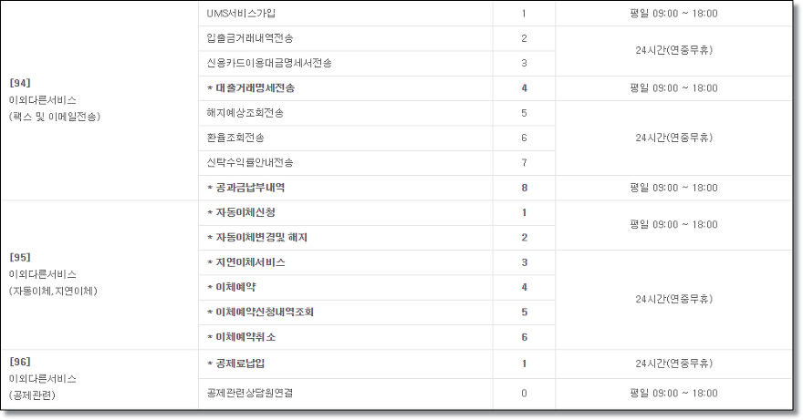 이 외에도 자동이체 신청 및 변경, 해지, 예약, 공제료 납입 등 ARS서비스를 통해 다양한 은행업무를 볼 수 있습니다. ARS 단축코드를 확인하여 원하는 업무를 신속하고 빠르게 처리하시기 바랍니다.