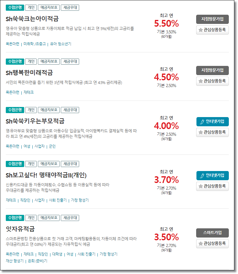 조금이라도 높은 금리의 예·적금 상품을 가입하기 위해 수협 은행을 이용하고 있습니다. 저 같은 경우도 농협과 하나은행을 주로 사용하다가 금리가 높아서 적금 상품을 하나 가입했습니다.
