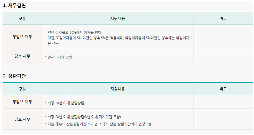 무담보일 경우 약정 이자율 50%까지 인하가 가능하며 담보 채무일 경우 연체이자만 감면해주는 지원을 하고 있습니다. 상환기간은 종류에 따라 다르다는 점 참고하시기 바랍니다.