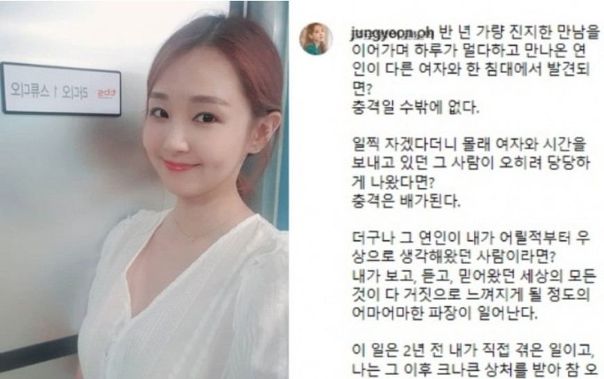 그러나 오정연이 SNS를 통해 올린 글이 큰 파장을 불러 일으켰습니다. 2년전 연인이 바람을 피웠으나 오히려 당당하게 나왔다는 이야기로 내용상에 이름은 거론 되지 않았지만 "어제 오늘 실검에 떠 있는 두 당사자들의 이름을 보니 다시 그 악몽이 선명하게 떠오른다."라는 문장과 "그 연인이 내가 어릴 적 부터 우상으로 생각해왔던 사람이라..."는 글에서 강타임을 충분히 유추할 수 있었기 때문이었습니다.