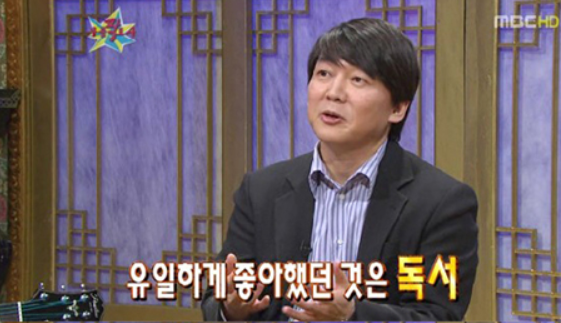 안철수는 과거 ‘황금 어장 – 무릎팍 도사’에 출연하여 스스로 “활자 중독증이었던 것 같다”라고 밝히며 “제가 좋아했던 것은 과학책이나 소설책을 좋아했다"며 "교과서는 별로 안 좋아했다"라고 웃으며 덧붙였습니다.