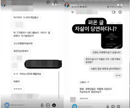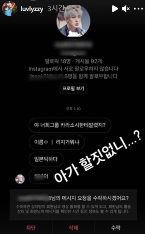 리지가 악플러의 글을 박제하자 악플러는 “야 왜 박제함?”이라고 메시지를 보냈고 리지는 “ㅋㅋ”라며 쿨한 반응을 보였다.