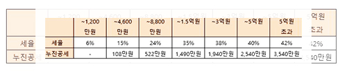 기본적으로 재산의 금액에 따라 세율이 다르게 나뉘는데 1,200만 원 이하의 경우 세율이 6%로 적용이 되고 누진공제액은 없습니다. 하지만 1,200만 원~4,600만 원 이하의 경우 세율이 15% 적용되지만 108만 원이 누진 공제가 됩니다. 이후 위의 표를 보시면 금액이 점차 올라가면 세율은 조금씩 올라가고 누진 공세도 조금씩 올라가게 됩니다.