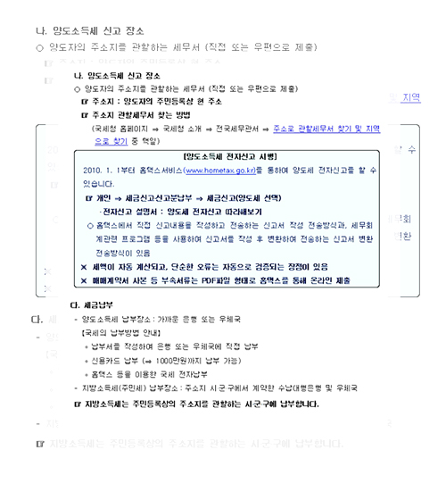 양도소득세 신고방법은 크게 2가지로 나눌 수 있습니다. 가장 먼저 방문 및 서면 신고 입니다. 이 경우에는 양도자 주소지의 관할 세무서에 방문하여 신청하는 것입니다. 반드시 양도자의 주민등록상 주소의 관할 세무서에 방문해야 하며 아까 말씀드린 서류들을 준비하시어 방문하시면 됩니다.