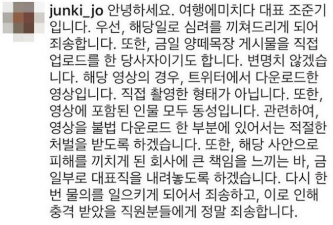 영상이 올라온후 '여행에 미치다'에서 1차 공식 입장문에 애매한 사과를 올려 항의가 빗발치자 2차 공식 입장문을 올렸습니다. 조준기 대표는 해당 영상은 불법 촬영이 아니며 트위터에서 퍼온 영상이라고 해명했습니다.