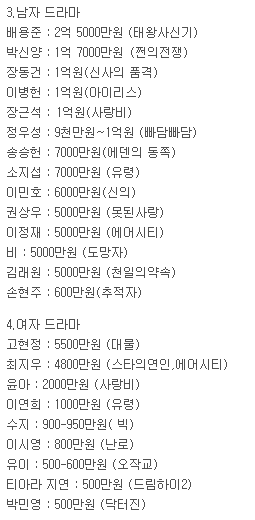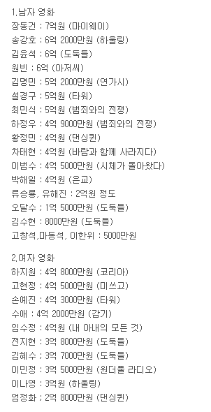 참고로 남녀 영화배우들과 탤런트들의 출연료.