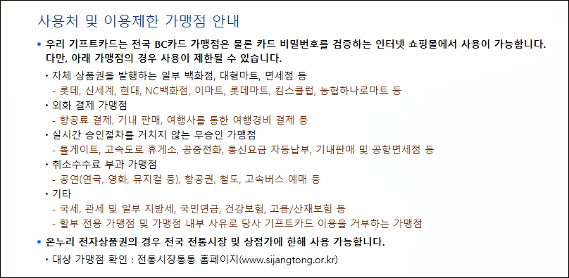우리카드가 발행하는 상품권형 카드로 전국 신용카드 가맹점에서 사용할 수 있습니다. 그러나 일부 백화점과 무승인가맹점, 면세점에서는 사용 불가능하니 아래 사진 참고하시기 바랍니다.