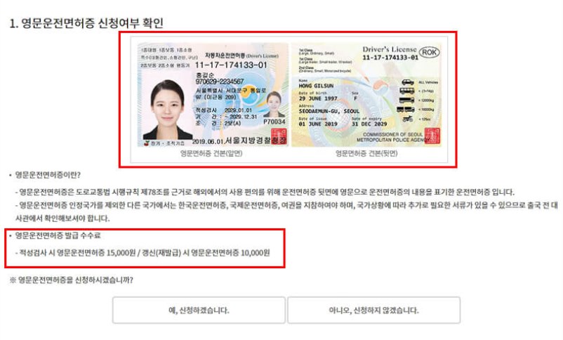 그 후 영문면허증 신청여부를 확인하는데요. 해외에서 운전하는 일이 많다면 신청을 해주면 되겠습니다. 그 후 마지막으로 신청내역을 최종확인 후 결제를 하면 됩니다.