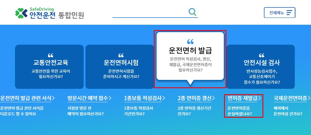 안전운전 통합민원 사이트에 접속한 후 메인화면에 보면 운전면허증과 관련된 메뉴들을 확인할 수 있습니다. 여기서 운전면허 발급 메뉴를 클릭해주면 운전면허증 분실신고와 관련된 면허증 재발급 메뉴를 확인할 수 있는데요. 이를 클릭해서 다음 과정을 계속 진행해주면 됩니다.