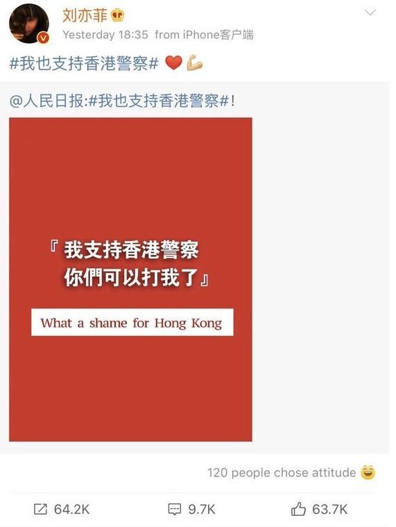 유역비는 지난 14일 중국 SNS 계정에 '나는 홍콩 경찰을 지지한다. 나를 쳐도 된다', '홍콩은 부끄러운 줄 알라'(What a shame for Hong Kong)는 문구가 적힌 사진을 게시했다.