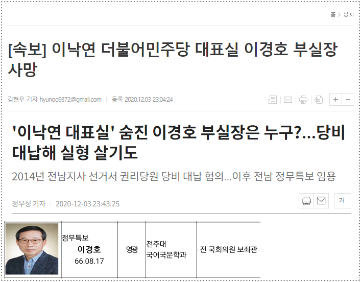 이낙연 대표실 부실장 이경호씨가 자살했다고 합니다. 옵티머스자산운용 관련 업체로부터 '복합기 임대료 지원'을 받았다는 의혹과 관련해 검찰에서 조사하던 중 저녁을 먹고 오겠다며 나간 후로 숨진채 발견되었습니다. 유서는 발견되지 않았지만 숨지기 직전 가족에게 "미안하다"라고 전했다고 하는데요. 과거에도 이낙연 때문에 실형을 살았던 적이 있을 만큼 이낙연이 국회의원 시절부터 오래도록 함께 최측근이였는데요. 극단적 선택을 한 이유가 무엇일까요? 자세히 알아보도록 하겠습니다.