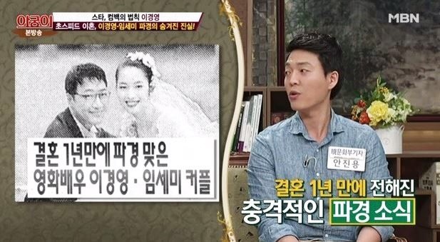 이경영은 1997년 38세의 나이에 임세미와 결혼했습니다. 당시 임세미는 이경영보다 12살 연하인 26세였는데요. KBS슈퍼탤런트 출신인 신인 배우였습니다. 둘은 1998년 결혼 1년 만에 아이를 낳고 이혼했는데요. 이혼 하기 7개월전부터 별거에 들어갔으며 임세미는 만삭인 상태로 홀로 산부인과에서 아들을 낳았다고 합니다.