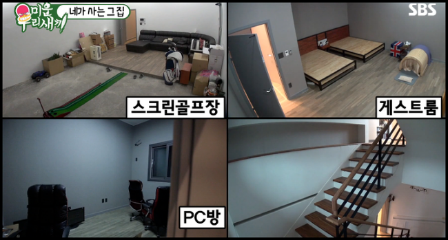 장동민 집은 근처에 아무것도 없이 허허벌판 속에 자리잡고 있습니다. 하지만 위치를 떠나 미니콘도를 연상하게 할 정도로 잘 꾸며놓고 크기 또한 어마어마 한데요. 3층 짜리 주택으로 방 개수는 10개 입니다. 각 방에는 PC방, 스크린 골프장, 게스트룸등으로 용도별로 꾸며놓았는데요. 청소하는데 10시간 이상 걸린다고 합니다.
