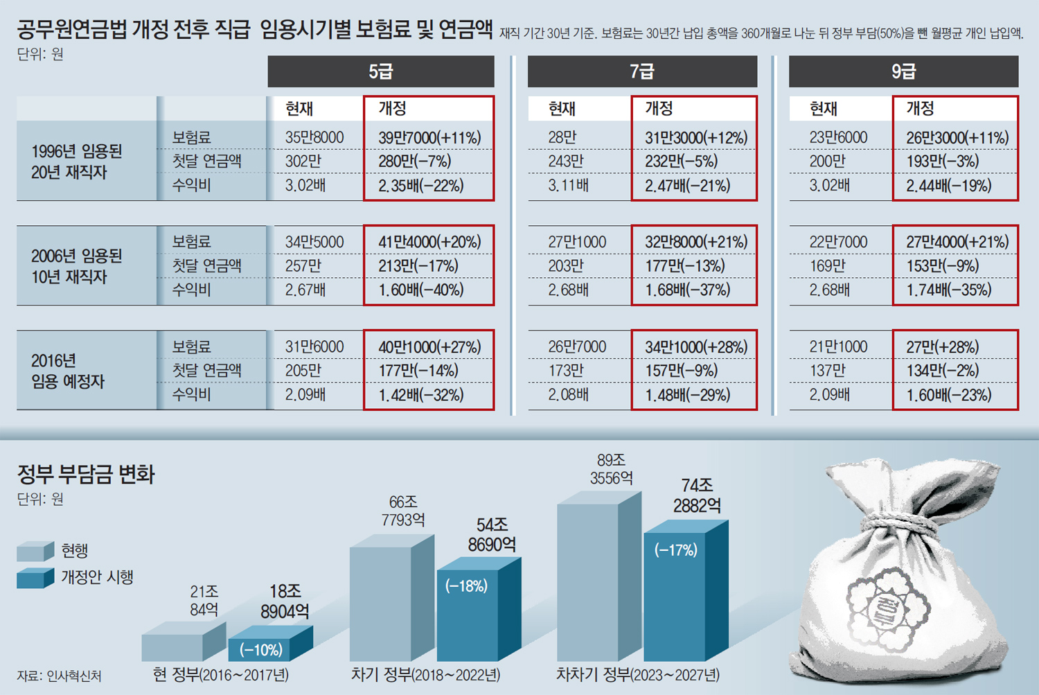 공무원 혜택의 꽃인 공무원 연금은 이미 심각한 적자 상태라서 연금개혁이 진행중에 있습니다. 따라서 2016년부터 연금지급률이 연도별로 상이하게 책정되어 있는 현실입니다. 본인 기여율과 정부 부담률이 9%로 상향되었고 연금지급률은 과거 1.8%에서 1.7%로 하향되었습니다.
