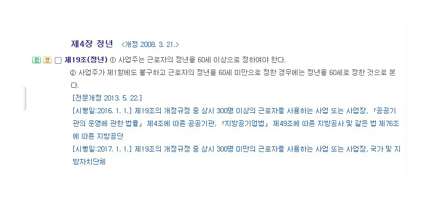 정년퇴직 나이에 대해 규정한 법률은 이름도 긴 고용상 연령차별금지 및 고령자고용촉진에 관한 법률입니다. 동법 제 19조 제1항에서는 사업주는 근로자의 정년을 60세 이상으로 정하여야 한다고 되어 있습니다. 만약 사업주가 60세 미만으로 정했다 하더라도 정년은 60세로 봅니다.