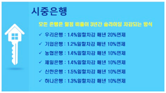 각 은행마다 별도의 면제기간이 존재합니다. 면제기간은 수수료를 내지 않아도 되는 경과 기간을 의미해요. 만약 대출을 받은 지 5년이 경과되었고 잔존기간이 5년, 면제기간이 5년이라면 수수료는 면제가 되는 것입니다.