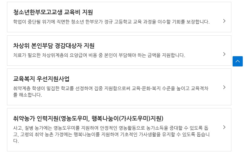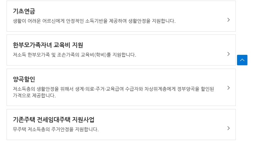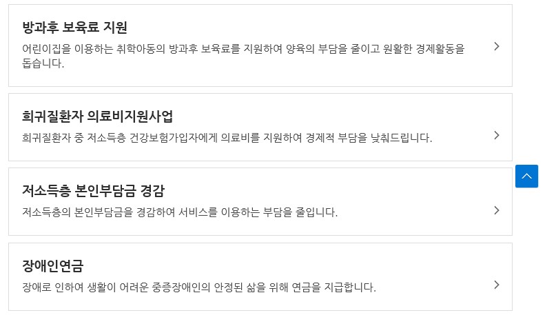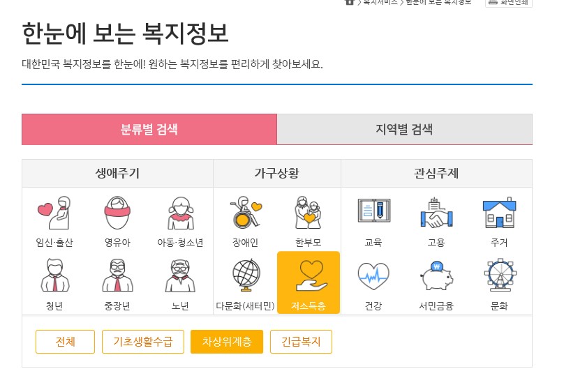 종류가 많기 때문에 검색하는데 불편함을 느낄 수 있을텐데요. 차상위계층 확인 방법 해당 관련 혜택은 복지로에서 [한 눈에 보는 복지정보]를 이용해 자신에게 해당되는 서비스를 선택한 후 검색하여 찾아볼 수 있는데요. 더욱 확인하기가 간편하고 다양한 혜택을 지원받을 수 있는데 도움을 받을 수가 있습니다.