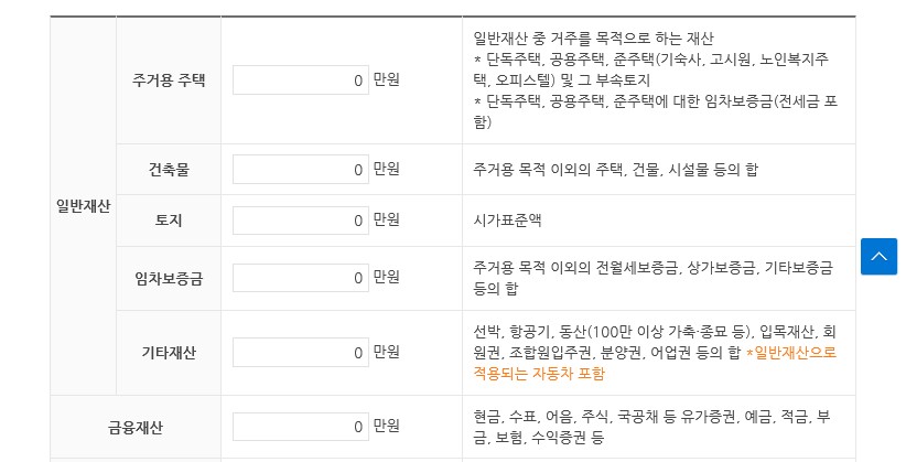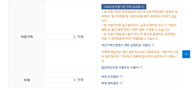 그럼 몇가지 정보를 입력해야 하는데요. 차상위계층 확인 방법을 위해 가장 먼저, 가구원수 및 거주지, 가구 정보 등의 사항인 기본정보를 입력 및 체크해줍니다. 그 후 자신의 소득과 지출요인, 일반재산, 금융재산, 차량가액, 부채 등을 입력해줍니다.