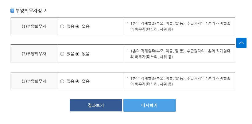 1촌의 직계혈족(부모, 아들, 딸 등), 수급권자의 1촌의 직계혈족의 배우자(며느리, 사위 등) 등의 부양가족이 있을 경우에는 체크를 한 뒤 [결과보기]를 클릭해주면 됩니다. 혹시 모르는 사항이 있다면 관련 문의사항을 참조하면 되겠습니다.