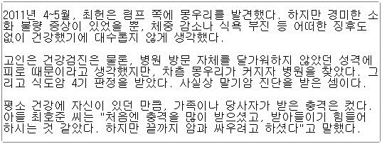 이처럼, 최헌은 경미한 증상으로 병원을 찾았고, 병원에서 '식도암 4기'(사실상 거의 말기 수준) 판단을 받았을 때는 이미 병세가 많이 진행된 상태였죠.