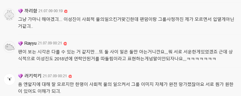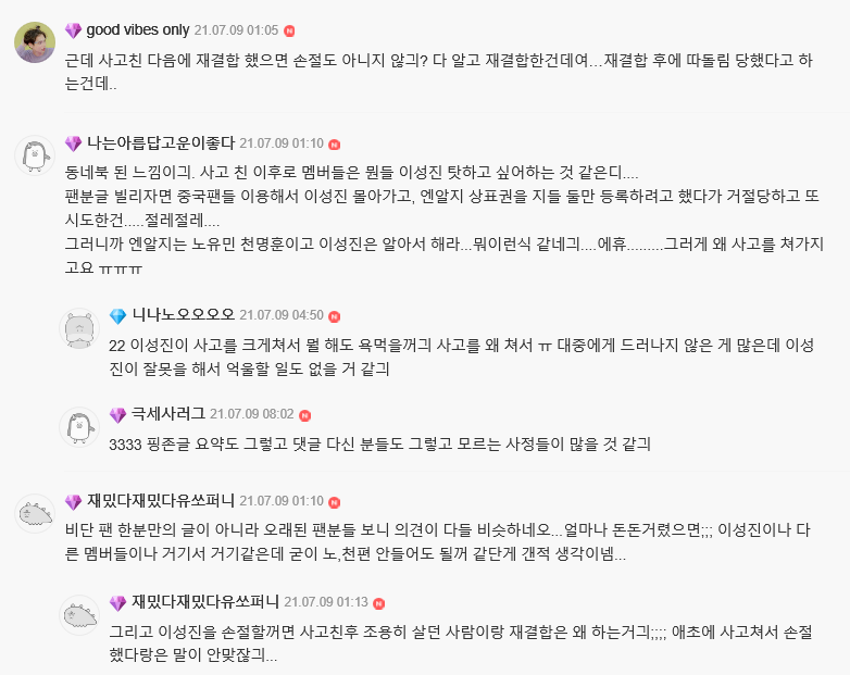 더 이상 NRG 멤버들에 관한 불미스러운 기사가 나지 않았으면 좋겠다고 말하며 팬들에게 미안함과 NRG그룹에 대한 애정을 드러냈어요