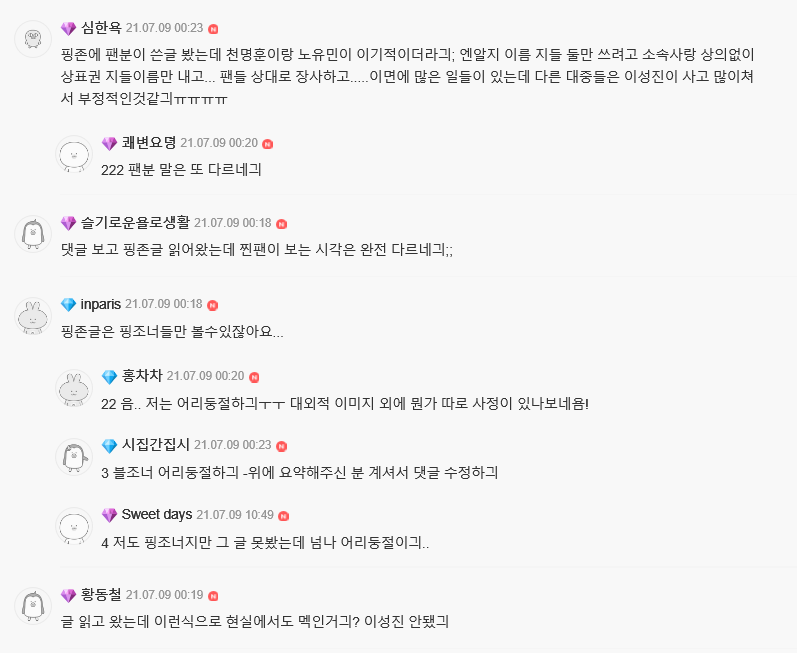 NRG 멤버들(이성진, 천명훈, 노유민)의 논란이 커지자 노유민도 자신의 인스타그램에 이성진과 주고받은 카톡내용을 공개하며 이성진이 2018년부터 따돌림(왕따)를 당했다고 주장하는데 과연 이게 따돌림(왕따)를 당하는 사람과의 대화라고 생각하냐며 반문을 했어요