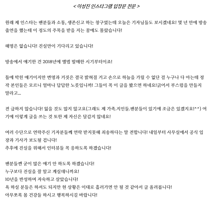 NRG의 이성진은 거기에 대하여 인스타그램을 통해 또 입장문을 올렸어요