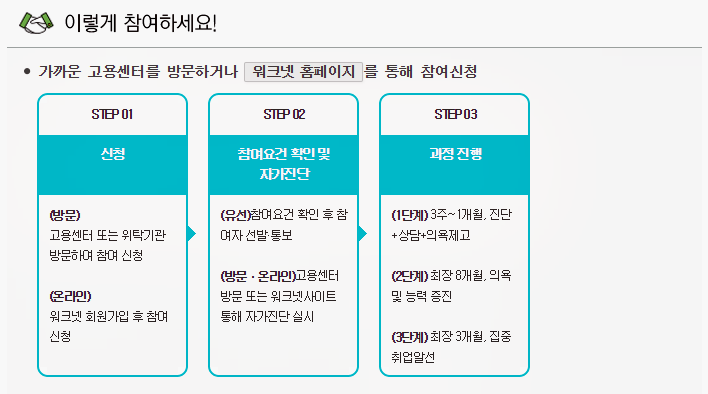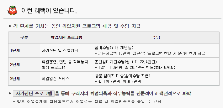 각 단계를 거치는 동안 참여수당을 받을 수 있습니다. 1단계는 자가진단 및 심층상담을 통해 진로를 정하고 참여수당으로 최대 20만원까지 받을 수 있습니다. 2단계로 직업훈련 등을 거치게 되며 월 최대 28.4만원을 받을 수 있는데 최대 6개월까지 가능합니다. 3단계는 취업알선 서비스로 월 1회 2만원 최대 6만원까지 받을 수 있답니다.