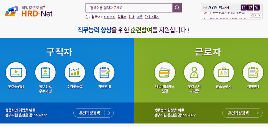 내일배움카드 신청은 직업훈련포털 사이트에서 신청할 수 있습니다. 실명인증 및 공인인증서가 필요하니 준비한 상태에서 신청하면 됩니다. 위에 바로가기 링크를 걸어드렸으니 클릭하고 들어가 신청하시길 바랍니다.