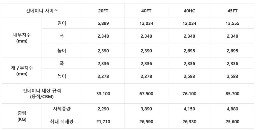 이렇게 컨테이너 사이즈가 규격화되어 있어도 모든 사이즈의 컨테이너를 다 이용하는 것은 아닙니다. 실제로 컨테이너 종류 중에서 20FT, 40FT, 40HC를 흔히 사용하고 45FT는 흔히 사용하는 사이즈가 아닙니다. 그리고 컨테이너 자체중량의 경우 같은 20FT 컨테이너라도 조금씩 상이하나 규정에 크게 벗어나지 않으니 참고만 하면 됩니다.
