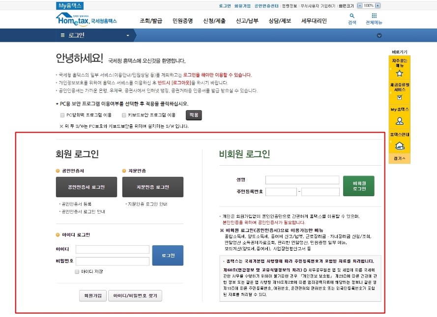 그 다음 폐업신고방법 진행사항으로는 본인인증을 위한 공인인증서 로그인을 해줘야 합니다. 세무나 각종 신고에 대한 사항은 본인인증을 거쳐야 일을 진행할 수 있는데요. 공인인증서 로그인이나 지문인증 로그인을 해서 본인인증을 거쳐주어야 합니다. 만약 공인인증서가 없다면 비회원 로그인을 통해 본인인증 후 진행을 해줘야 합니다.