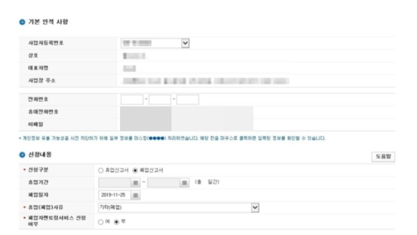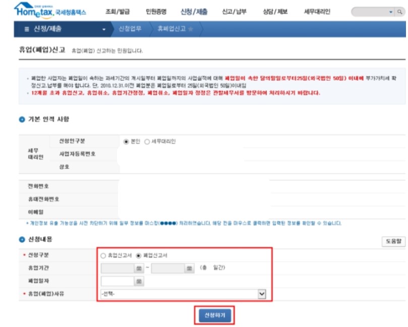 폐업신고방법으로 신청내용의 신청구분을 보면 휴업신고서와 폐업신고서가 있습니다.
