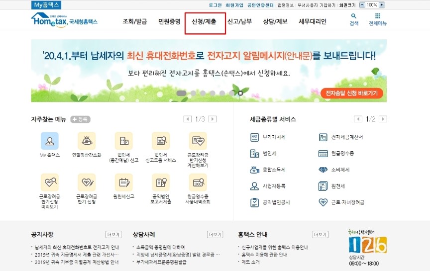 폐업신고를 하기 위해 국세청 홈택스 사이트에 접속해 줍니다. 세무와 관련된 각종 신고 및 환급 등에 관해 모든 업무를 처리할 수 있는 곳인데요.