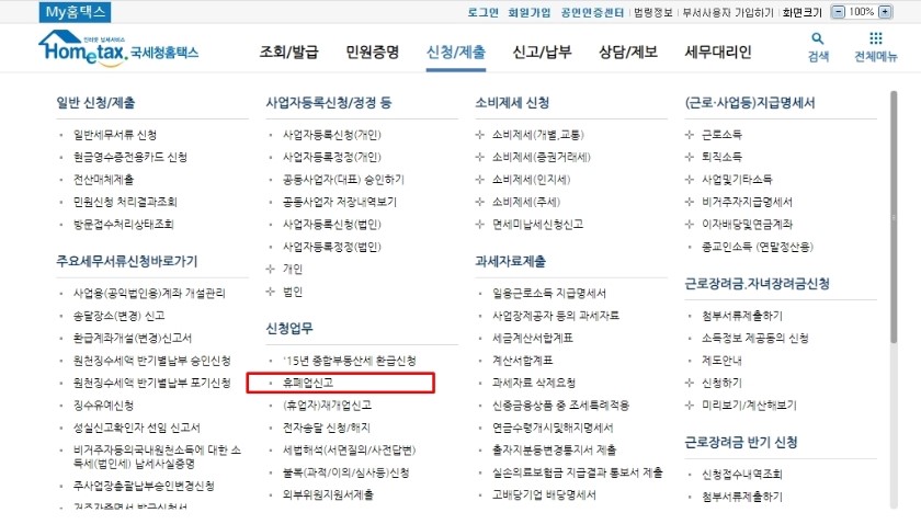 폐업신고방법은 홈택스 메인화면 상단에 메뉴를 살펴보면 신청/제출이 있습니다. 이를 클릭해서 여러가지 민원을 해결할 수 있는데요. 이 중에서 신청업무-휴폐업신고를 클릭해 줍니다.