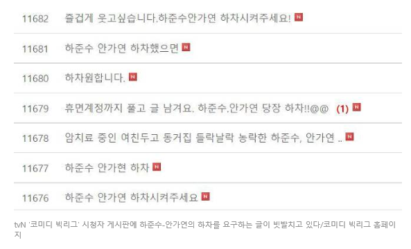 이에 코빅 팬들은 도의적으로 옳지 못한 행동을 한 하준수(하카소)와 안가연을 코빅에서 하차시켜야 한다는 반응인데도 하준수는 코빅 녹화에 참여했다고 하는데요