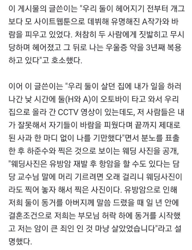 전 여자친구가 암투병을 하는 과정에서 자신이 헌신적으로 도왔던 부분들을 언급하며 그런 부분 때문에 전 여자친구가 하준수 자신에게 미안하고 고마워서 그 동안 공론화하지 않고 용서해준것이라고 생각했다고 해요